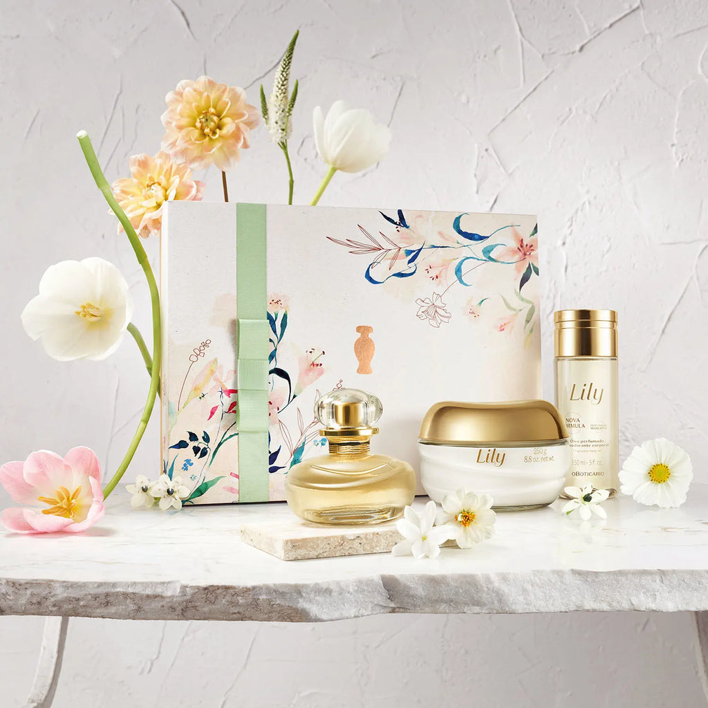 O Kit Presente Dia das Mães Lily foi a escolha especial da personagem Sandra, da Novela Renascer para mostrar à sua mãe o quanto ela merece celebrar a vida. Clássico, traz três itens de uma das linhas mais sofisticadas de O Boticário. O encanto da linha proporciona todo o cuidado e carinho que a sua presenteada merece nos dias das mães e em todas as ocasiões. Além do frasco em miniatura que traz a fragrância da linha, o kit vem pronto para presentear em uma caixa para presente que transmite cuidado em cada detalhe: